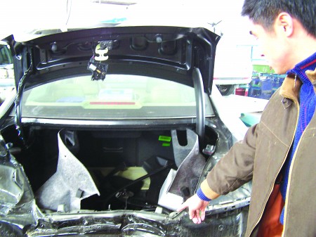 當(dāng)著記者面,叢經(jīng)理解釋說(shuō),“ 后圍”是中空鋼結(jié)構(gòu),和車體焊接在一起,外面是保險(xiǎn)杠,不是易損件,因此公司并無(wú)備件。關(guān)于于進(jìn)英的那輛待修車,其他配件都有,就是沒有這個(gè)“后圍”。2日上午10時(shí),上海方面就此剛與他溝通過(guò),他也沒得到任何承諾。
