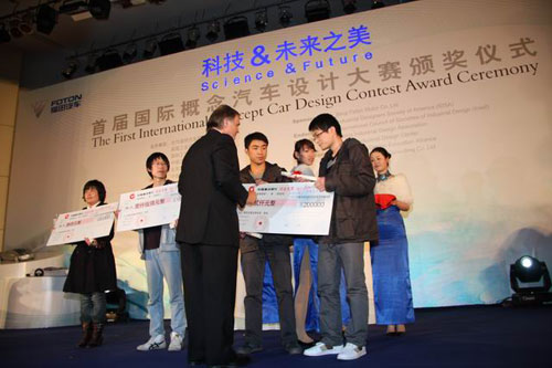 中新網(wǎng)4月29日電 日前,2010北京國際車展前一天,一場融匯了設(shè)計(jì)與科技的盛宴提前上演。主題為“科技&未來之美”的首屆國際概念車設(shè)計(jì)大賽,在福田汽車隆重舉行了頒獎儀式。國際工業(yè)設(shè)計(jì)聯(lián)合會主席Carlos Hinrichsen、美國工業(yè)設(shè)計(jì)師協(xié)會執(zhí)行董事克萊夫•魯、福田汽車總經(jīng)理王金玉、清華大學(xué)美術(shù)學(xué)院博士生導(dǎo)師柳冠中等領(lǐng)導(dǎo)和專家出席了頒獎儀式,來自全國各地的120多家新聞媒體記者也來到頒獎現(xiàn)場。本次大賽共決出了“最佳和諧美感獎”、“最佳創(chuàng)意未來獎”、“最佳前沿科技獎”三類單項(xiàng)獎,以及“最具人氣獎”和“最佳組織獎”等獎項(xiàng),而本次大賽最高獎項(xiàng)“全場大獎”被來自山東省工藝美術(shù)學(xué)院的王炎超、張知真奪得。