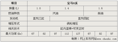 寶馬0系作為寶馬首款超緊湊型延續(xù)精準(zhǔn)操控的同時(shí),搭載了多款小排量渦輪增壓汽油和柴油引擎。其中由于發(fā)動(dòng)機(jī)調(diào)教和電腦匹配的不同,1.0和1.4渦輪增壓汽油引擎可分別調(diào)出兩款和三款不同的最大功率引擎。而1.6渦輪增壓柴油引擎,也可以分別調(diào)出67Kw、82 Kw和97 Kw三種不同的最大功率。小排量渦輪增壓引擎的運(yùn)用,不僅可以提升寶馬0系動(dòng)力性能,而且也進(jìn)一步降低了整車(chē)油耗。