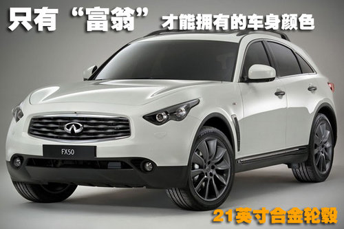 英菲尼迪FX“百萬富翁版”以F50S運動版為基礎開發(fā)而成,這款車型僅有獨特的月光白與曜石黑色兩種專屬的車身顏色可供選擇;疑21英寸“渦輪”造型輕合金輪轂是整車造型的亮點,更顯霸氣。