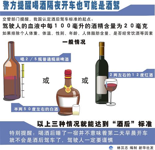 交管部門提醒,我國認(rèn)定酒后駕車標(biāo)準(zhǔn)的起點(diǎn)是,駕駛?cè)说难褐忻?00毫升的酒精含量為20毫克。從天津市以往查處情況看,如果排除個(gè)人體重、體溫、性別、年齡、人體脂肪含量、是否經(jīng)常飲酒等因素,一般喝2/5瓶普通瓶裝啤酒,或半兩50度左右的白酒,或2兩左右的12度紅酒,就能達(dá)到“酒后”標(biāo)準(zhǔn)。特別是,喝酒后睡了一宿并不意味著第二天早晨開車就不會(huì)是酒后駕車了。(記者劉元旭)