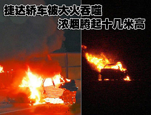 自燃的捷達轎車被大火全部吞噬,濃煙騰起十幾米高,油箱內泄漏的汽油在地面上也燃燒起來。車主稱,車輛行駛途中大燈突然熄滅,他將車?康铰愤叢蕚溆密嚿系臏缁鹌鬟M行撲救,但滅火器已經失效無法使用。
