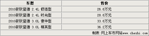 歐藍德是三菱汽車第一款采用轎車底盤形式生產(chǎn)的SUV,沿用了三菱Lancer(藍瑟)轎車的平臺,具有轎車乘坐的舒適性,同時它又有SUV的特性。全新一代的歐藍德EX采用了藍瑟EVO車型典型的隔柵及雙氙氣前車燈的造型,使得其看起來更加兇猛。2009年10月13日三菱汽車正式在中國地區(qū)推出了全新一代歐藍德EX車型,售價26.8-36.2萬元不等。近日我們從三菱汽車內(nèi)部人士處了解到,為了更好的滿足中國消費者,三菱汽車將在廣州車展上推出2.0排量的歐藍德車型,預(yù)計售價將在22萬元左右。與此同時,我們從北京地區(qū)三菱4S店了解到,目前2.4排量的已有現(xiàn)車銷售,但車型不全,全系車型暫時沒有任何型形式的優(yōu)惠。具體車型售價見下表: