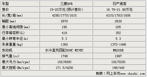 三菱RVR長寬高分別為4295/1770/1615,軸距為2670mm,與競爭車型逍客相比,車長還要略小一些,而軸距上稍具優(yōu)勢,離地間隙也比較接近,三菱RVR為195mm、逍客為205mm。而在動力上RVR搭載的是4B10 1.8L發(fā)動機(jī),最大功率102kw/rpm,而最大扭矩為171.5牛米。