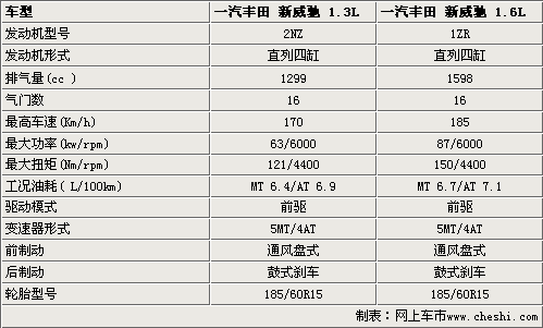 豐田新威馳將繼續(xù)搭載1.3L和1.6L兩款發(fā)動機,來滿足不同消費者的需求。這兩款發(fā)動機都是直列4缸16氣門引擎,具有可變節(jié)氣門技術(shù),在保證強勁動力輸出的同時,又可以達(dá)到了良好的節(jié)油性能,1.6L自動擋車型的百公里油耗僅為7.1L,1.3L手動擋車型的油耗更為節(jié)省,百公里油耗不到6.4L。在動力輸出方面,1.3車型的最大功率和最大扭矩分別達(dá)到了6.3Kw和121Nm,同時1.6車型的最大動力輸出也達(dá)到了87Kw和150Nm。在同級車中絕對稱得上是出類拔萃。在變速器方面,分別裝配上了5速手動變速器和4速手自一體變速器。新威馳的制動器均為前盤后鼓式制動器。