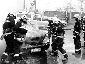 消防員對(duì)起火的轎車(chē)進(jìn)行撲救。