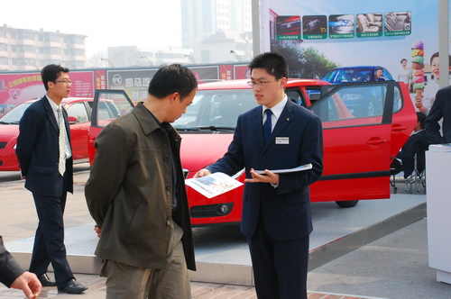 中新網(wǎng)4月19日電在2009(第六屆)全國百強縣市汽車巡展壽光站的現(xiàn)場筆者發(fā)現(xiàn)了這樣的一幕,與其他廠商不同,上海大眾斯柯達(dá)的經(jīng)銷商濰坊天和汽車銷售服務(wù)有限公司的銷售人員,不但在展位為前來咨詢的消費者進行講解,而且還走出展位,走到展位外面為消費者講解,吸引消費者來了解更多車輛信息。