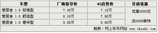 據(jù)4S店銷售人員介紹:目前新愛麗舍最高優(yōu)惠達(dá)2000元,店內(nèi)另送2000元裝飾。目前新愛麗舍現(xiàn)車非常充足,顏色齊全,白色、銀色等暢銷的顏色可供挑選。