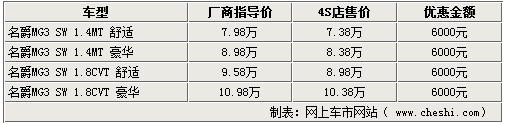 據(jù)銷售人員介紹,雖然適逢暑期促銷旺季,但是MG3 SW車型的新車存量較少,各店均開始調(diào)整優(yōu)惠價格。此次優(yōu)惠車型為MG3 SW 1.4L兩款車型,消費者購車時即可直接享受現(xiàn)金優(yōu)惠6000元,各店車型及顏色并不是很齊全,部分顏色仍需要預定,訂金為1000元。