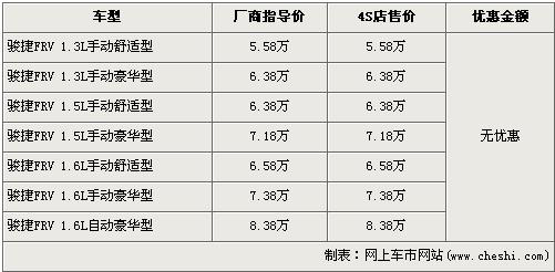 駿捷FRV是中華汽車首款兩廂車型,排量分為1.6L和1.3L,兩種排量車型分別在去年5月份和7月份上市。近期,駿捷FRV的車型再次得到了豐富,1.5L車型已經(jīng)進(jìn)入各家中華經(jīng)銷店并開(kāi)始售賣,駿捷FRV全系的售價(jià)區(qū)間為5.58萬(wàn)元-8.38萬(wàn)元。根據(jù)網(wǎng)上車市價(jià)格檢測(cè)系統(tǒng)顯示,駿捷FRV全系取消了現(xiàn)金優(yōu)惠,具體詳情請(qǐng)看下表: