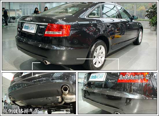 A6L尾部上方由圓潤的流線型改為略微翹起的棱角,具有擾流板的功效,同時也使尾部造型更顯硬朗和運動化。在車尾部分“公務版”A6L的特征在于取消了倒車雷達,但整體造型上左右雙出式的鍍鉻排氣管依然很有氣勢!