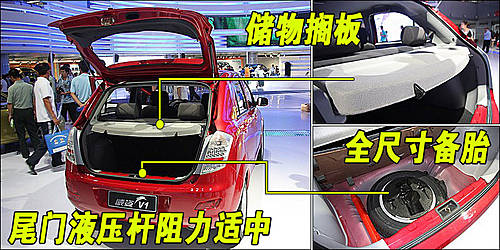 天津一汽威姿V1尾門開(kāi)啟輕巧,外部則需要用鑰匙開(kāi)啟。后備箱蓋采用機(jī)械式支撐,開(kāi)啟時(shí)支撐度一般,備胎位于行李箱底部。