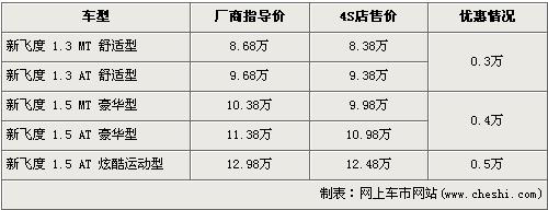 據(jù)廣州本田北京地區(qū)4S店銷售人員介紹,新飛度 1.5L炫酷運動版的優(yōu)惠金額為5000元。新飛度在售車型分為1.3L及1.5L共5個車型在售,1.3L車型優(yōu)惠金額為3000元。1.5L豪華版的手動和自動車型經(jīng)4000元優(yōu)惠后,現(xiàn)售價分別為9.98萬元和10.98萬元,1.5L炫酷運動版的優(yōu)惠5000元,現(xiàn)售價為12.48萬元。