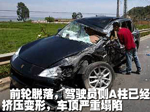 09年5月10日14時(shí)左右在高海公路金寶山滇池附近的公路輔路上,發(fā)生了這樣一起令人后怕的恐怖車(chē)禍。一臺(tái)嶄新的(準(zhǔn)確的說(shuō),是還沒(méi)有上牌的)保時(shí)捷卡宴,與一臺(tái)拉著水泥運(yùn)輸大罐車(chē)“迎面相撞。