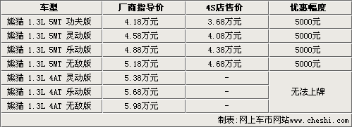 據(jù)吉利汽車4S店銷售人員介紹,熊貓1.3L手動(dòng)擋車型目前都有現(xiàn)車銷售,而自動(dòng)擋雖然已經(jīng)上市,但由于北京地區(qū)無法上牌,所以還沒有現(xiàn)車抵達(dá)北京市場(chǎng),預(yù)計(jì)最早會(huì)在今年年底前解決無法上牌的問題。目前熊貓1.3L手動(dòng)擋全系可以優(yōu)惠五千元,而這款車型還增加了電動(dòng)升級(jí)后窗,需要在原價(jià)的基礎(chǔ)上加1000元。
