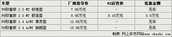 據(jù)比亞迪4S店銷售人員介紹,目前比亞迪F6只有2.0L手動(dòng)舒適型有現(xiàn)車銷售,可以優(yōu)惠8000元現(xiàn)金,如果到店詳談還可以有更多的優(yōu)惠政策。而2.0L手動(dòng)標(biāo)準(zhǔn)型因?yàn)榕渲幂^低,北京市場(chǎng)一直就沒有現(xiàn)車;2.4L車型也需要預(yù)定,交付訂金后需等半個(gè)月左右即可提車。