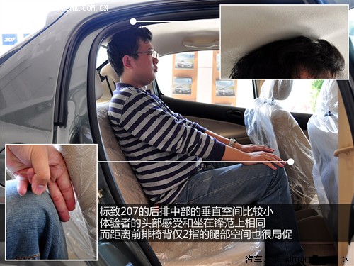 坐在標(biāo)致207后排兩邊的正常座位上,體驗者頭部距離車頂僅兩指,這不太符合基本舒適性的要求,但也可以忍受。而腿部空間的表現(xiàn)可以被接受,頭枕的可調(diào)高度很符合安全性及舒適性的綜合標(biāo)準(zhǔn)。