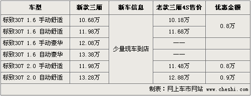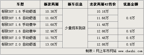 據(jù)東風(fēng)標(biāo)致北京地區(qū)4S店銷售人員介紹,目前還有少量老款307車型在售,優(yōu)惠幅度較大,手動(dòng)檔車型還贈(zèng)送加油卡,現(xiàn)在購(gòu)買比較劃算。新款307車型少量現(xiàn)車已到店,但車型及顏色還不齊全,預(yù)訂要交定金3千元,提車等1個(gè)月,而且暫無任何優(yōu)惠。如想購(gòu)買新款車型的朋友不妨等一陣時(shí)間,新款307大批量現(xiàn)車會(huì)陸續(xù)到店。