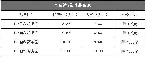 今年4月初,長安馬自達推出了兩款馬自達2超值版車型,使得馬自達2 1.5L排量的最低售價降至8.88萬元,對于購車預(yù)算在9萬元以內(nèi)的朋友來說,又多了一款選擇的車型。近日,我們從北京地區(qū)的一家長安馬自達汽車綜合經(jīng)銷商處了解到,目前馬自達2 1.5L最高可優(yōu)惠1萬元,其中超值版最低配售價已經(jīng)降至7萬元區(qū)間,性價比和新嘉年華相比高出不少。以下是馬自達2最新報價表: