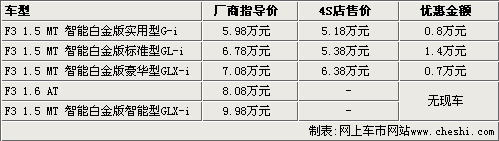 據(jù)比亞迪汽車4S店銷售人員介紹,目前比亞迪F3智能白金版只有實用性、標準型和豪華型有現(xiàn)車銷售,智能型和自動擋車型都沒有現(xiàn)車,及時預訂也無法得知具體到店時間,F(xiàn)在購買比亞迪F3智能白金版可以有較大的優(yōu)惠幅度,其中實用型優(yōu)惠8000元;豪華型可以優(yōu)惠7000元;而標準型最高則可以優(yōu)惠1.4萬元。該比亞迪4S店銷售人員表示,如果到店詳談,還可以有更多的優(yōu)惠幅度。