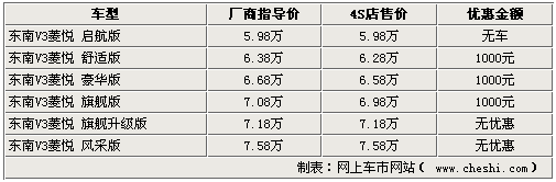 據(jù)東南經(jīng)銷商處銷售人員介紹,目前V3菱悅風(fēng)采版及升級后的旗艦版正在逐步充足貨源,最低配的車型仍因尚未投產(chǎn)而無法購買,請消費者諒解。V3風(fēng)采版系列車型各店已少量到店,而升級后的旗艦版V3也正在全國配送當(dāng)中。銷售人員還說,現(xiàn)在購車不論風(fēng)采版還是升級的旗艦車型均沒有任何形式的現(xiàn)金優(yōu)惠,僅有精美的裝飾贈送。而老款的V3菱悅旗艦版則可以優(yōu)惠1000元。