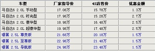 據(jù)北京地區(qū)一汽馬自達(dá)4S店銷售人員介紹,目前購買睿翼或馬自達(dá)6均有較大的優(yōu)惠幅度。睿翼車型全系優(yōu)惠現(xiàn)金1.5萬元,且現(xiàn)車顏色齊全,同時(shí)老款車型最高讓利2.7萬元,車價(jià)最低僅為15.28萬元。并且購買新老車型均有裝飾贈送,新老款車型消費(fèi)者可以根據(jù)需求選購。北京地區(qū)各4S店由于訂單不同,各店銷售的現(xiàn)車顏色有所不同。