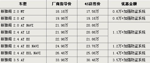 據(jù)廣州本田北京地區(qū)4S店銷售人員介紹,現(xiàn)購買新雅閣均有6千-3.5萬不等的優(yōu)惠,最低售價17.58萬,另贈送“車行無憂”加強(qiáng)防盜系統(tǒng),例如您的車被拖走也會第一時間知道。3.5AT頂級型目前現(xiàn)車較少,則需要預(yù)定。