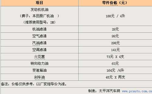 廣汽本田為雅閣提供3年或十萬公里的質(zhì)保期限,首保是在5000公里,以后每過5000公里保養(yǎng)一次。與大多數(shù)日系車型相同,廣汽本田對雅閣車型機油機濾更換周期的官方建議是5000公里,廣汽本田4S店一般建議車主使用級別較高的SM級本田原裝機油。每次常規(guī)保養(yǎng)用料費用為217元,加上200元的更換機油機濾工時費一共是417元。在4萬公里內(nèi)進(jìn)行常規(guī)保養(yǎng)總共6次。到了2萬公里的時候,車主要在常規(guī)保養(yǎng)基礎(chǔ)上增加空氣濾清與空調(diào)濾清的保養(yǎng),保養(yǎng)費用也相應(yīng)的增加,需要707元。而到了4萬公里的時候要進(jìn)行一次大保養(yǎng),需要更換機油機濾、空氣濾清、空調(diào)濾清、汽油濾清、火花塞與變速箱油,而保養(yǎng)費用也需要過千元,達(dá)到1611元。