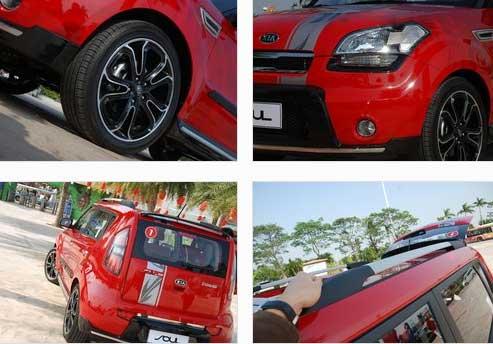 東風(fēng)悅達(dá)起亞SOUL由官方提供了一套改裝配件,正如您在上面照片中所看到的,包括前后保險(xiǎn)杠、大燈下方的燈眉、18寸黑色花型輪轂、車身側(cè)面裙邊包圍、后尾翼以及車身拉花,一臺(tái)普通的SOUL就這樣變身為了一臺(tái)與眾不同的SOUL,多了幾分動(dòng)感也多了幾分張揚(yáng)。
