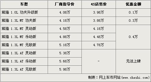 據(jù)吉利汽車4S店銷售人員介紹,吉利熊貓近期有最高4000元的優(yōu)惠。新推出的1.0L車型優(yōu)惠為1000元,售價降到了3.98萬元。1.3L手動功夫版優(yōu)惠3000元,售價降到了3.88萬元,其他手動擋車型優(yōu)惠4000元。由于熊貓1.3L自動檔車型尾氣排放不合格,所以無法在北京上牌照。銷售人員還介紹,目前1.0L車型較緊張,1.3L車型現(xiàn)車充足。