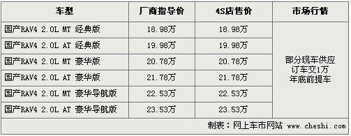 據(jù)一汽豐田北京地區(qū)4S店銷售人員介紹,目前該車有部分車型少量現(xiàn)車,由于RAV4貨源比較緊張,大部分車型及顏色消需要提前預(yù)定,訂車需要等待2個(gè)月的時(shí)間,也就是要到年底前才可以提到現(xiàn)車。如果著急購(gòu)買,需加價(jià)現(xiàn)金一萬(wàn)元或在4S店購(gòu)買等值的裝飾,F(xiàn)車顏色以黑色、白色、銀色為主。北京地區(qū)各4S店由于訂單不同,各店銷售的現(xiàn)車顏色有所不同。