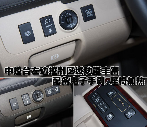 新皇冠的內(nèi)飾部分采用了傳統(tǒng)的桃木面板裝飾,黑色的中控臺與米色的內(nèi)飾非常協(xié)調(diào)。方形的出風(fēng)口以及控制區(qū)域都顯得中規(guī)中矩,并沒有太多的亮點。桃木和真皮結(jié)合的四幅方向盤在做工上比較細膩。