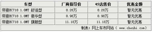 據(jù)北京地區(qū)帝豪4S店銷售人員介紹,帝豪EC718共有三款車型,售價8.28萬元起。目前店內車型顏色不是很全,消費者可以到店看車、購買;暫時沒有的顏色可預訂,訂金3000元,預計交車時間大概在一個月左右。全系車型因是新車,所以暫時沒有現(xiàn)金優(yōu)惠或贈品,還請消費者諒解。