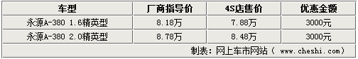 永源汽車旗下的A-380車型在經(jīng)銷商處現(xiàn)可給出3000元的現(xiàn)金優(yōu)惠。經(jīng)銷商表示,現(xiàn)在店內(nèi)的1.6L及2.0L車型均可滿足消費者購車的需要,顏色也比較齊全。