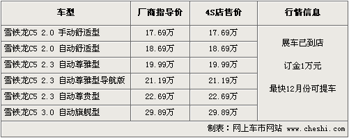 據(jù)東風雪鐵龍4S店銷售人員介紹,C5目前已開始接受預(yù)訂,訂金為1萬元,目前陸續(xù)已有客戶開始訂車,最快12月份可以提到現(xiàn)車。C5的展車現(xiàn)已到店,對這款車感興趣的朋友不妨親身去體驗一下。