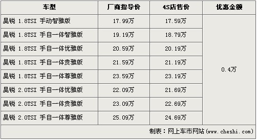 據(jù)北京斯柯達(dá)經(jīng)銷店銷售人員介紹,斯柯達(dá)昊銳共分為8個(gè)車型,售價(jià)區(qū)間為17.99-25.09萬(wàn)元。目前店內(nèi)昊銳全系有4000元的現(xiàn)金優(yōu)惠,經(jīng)優(yōu)惠后,昊銳的售價(jià)區(qū)間降為了17.59萬(wàn)-24.69萬(wàn),并且店內(nèi)的昊銳現(xiàn)車比較充足,消費(fèi)者挑選的空間也較大。