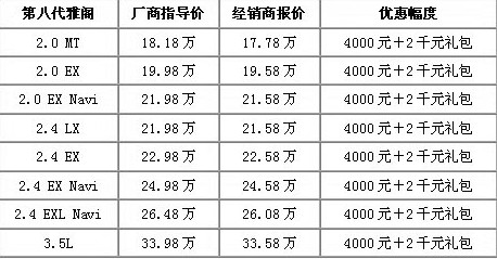 新雅閣,自誕生之日起就打著“史上最強(qiáng)雅閣”的旗號(hào),10月更是一舉奪得昆明中級(jí)車上牌量亞軍,其實(shí)力不容小覷。近日,車天下編輯從廣本梁源店獲悉,自2009年12月14日至12月31日購(gòu)置雅閣車型即可享受4000元?dú)q末現(xiàn)金優(yōu)惠以及2000元店慶購(gòu)車禮包。具體車型及詳細(xì)優(yōu)惠政策,如下表: