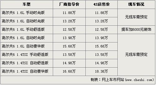 據(jù)北京一汽大眾4S店銷售人員介紹,目前高爾夫6全系只有1.6L手動舒適版有現(xiàn)車,欲提這款車型的消費者需在購車時加裝店內(nèi)價值6000元的裝飾后方可提車。店內(nèi)其他車型均無現(xiàn)車,欲購買者需交訂金2000元,約等3個月后才可提車。