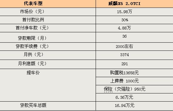 威麟X5將于新年第一天正式上市,目前這款車只有一個版本—威麟X5 2.0TCI。雖然這款車還未上市,但是已經(jīng)出現(xiàn)了貸款方案,方便了一些想通過貸款買車的朋友。威麟X5的市場指導(dǎo)價已經(jīng)曝光為15.98萬元,按照首付三成三年貸款的方案,首付凈車款只要4.88萬,三年下來貸款買車總額為16.94萬元。