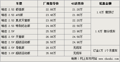 據(jù)一汽豐田4S店銷(xiāo)售人員介紹,目前銳志可優(yōu)惠1.6萬(wàn)元,現(xiàn)車(chē)比較齊全,一般購(gòu)買(mǎi)車(chē)型主要集中在舒適版和紀(jì)念版,消費(fèi)者可根據(jù)需要選購(gòu)。另?yè)?jù)介紹,新銳志車(chē)型要在明年4月北京車(chē)展亮相,之后2個(gè)月左右才可以購(gòu)買(mǎi)到,并且新款車(chē)型剛上市不會(huì)有現(xiàn)款這么大的優(yōu)惠空間,目前購(gòu)買(mǎi)現(xiàn)款銳志也是一個(gè)不錯(cuò)的選擇。如消費(fèi)者有意購(gòu)買(mǎi),到店詳談會(huì)有更優(yōu)惠的價(jià)格。北京地區(qū)各4S店由于訂單不同,各店銷(xiāo)售的現(xiàn)車(chē)顏色有所不同。