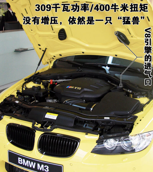 雖然外形和普通BMW3系很相似,但是他們和普通BMW3系相同的也只有這些。由于代表寶馬尖端性能的跑車,M3的車身采用了大量輕量化的材料,懸掛和車身部件大量采用了鋁合金輕量化材料,使車身整備質量大幅度降低,因為誰都知道“輕巧”和“笨重”之間的含義,輕巧而剛強的車身是操控敏捷性的前提。不過,由于外形更大,這款M3比它的前輩重160千克。
