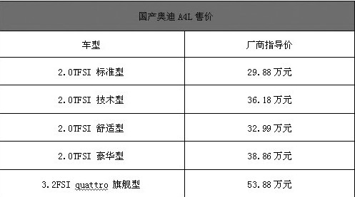 2009年1月5日,一汽-大眾在海南省三亞市正式宣布其開(kāi)始在國(guó)內(nèi)銷售奧迪A4L,這是第8代奧迪A4的國(guó)內(nèi)版本。新的奧迪A4L在今天共有裝備2款發(fā)動(dòng)機(jī)的5款車型銷售,官方指導(dǎo)價(jià)格從29.88到53.88萬(wàn)元,相信在一段時(shí)期內(nèi),國(guó)內(nèi)消費(fèi)者在全國(guó)各大奧迪4S店購(gòu)買A4L的時(shí)候都會(huì)執(zhí)行這個(gè)售價(jià)。