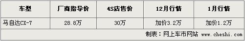 據(jù)一汽馬自達(dá)4S店銷售人員介紹:CX-7自上市起一直加價(jià)3.2萬元,近期該車型加價(jià)所有降低,提現(xiàn)車需加價(jià)1.2萬元,日前店內(nèi)有黑色及銀色現(xiàn)車供應(yīng),購(gòu)車可贈(zèng)送貼膜、倒車?yán)走_(dá)等裝飾。如消費(fèi)者有意購(gòu)買,到店詳談會(huì)有更優(yōu)惠的價(jià)格。北京地區(qū)各4S店由于訂單不同,各店銷售的現(xiàn)車顏色有所不同。