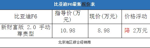 比亞迪F3是去年的銷量冠軍,和F3相比,比亞迪F6要低調(diào)很多,但是這并不意味著F6的性價比低。昨日,編輯從北京地區(qū)的幾家比亞迪汽車綜合經(jīng)銷商處了解到,近期比亞迪F6的優(yōu)惠再次增加,銷量最高的2.0手動尊貴版目前的降幅已經(jīng)達到了2萬元,購車后如果在店內(nèi)做一條龍服務(wù)的話,還可以再優(yōu)惠2000元,性價比非常不錯。