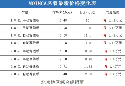 近日,編輯從北京地區(qū)綜合經(jīng)銷(xiāo)商處了解到,現(xiàn)代MOINCA名馭的現(xiàn)車(chē)比較充足,即使是冷門(mén)顏色車(chē)型,預(yù)定等待的時(shí)間也不會(huì)很久。據(jù)經(jīng)銷(xiāo)商透露,MOINCA名馭最高可以優(yōu)惠不到1.5萬(wàn)元,并且會(huì)贈(zèng)送一些基本的汽車(chē)裝潢;但是消費(fèi)者要想以這個(gè)價(jià)格提車(chē),需要在店內(nèi)做一條龍,其中車(chē)輛四項(xiàng)基本保險(xiǎn)可以打9.5折(約合4100-4600元左右)。以下是MOINCA名馭最新價(jià)格變化表: