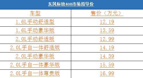 1月25日,東風標致408在北京全球首發(fā)上市,共推出1.6L和2.0L排量7款車型,售價12.19-16.99萬元。這是標致汽車品牌創(chuàng)立120年以來,首次在海外市場全球首發(fā)其最新一代車型。這不僅顯示出中國市場日漸提升的重要地位,更凸顯標致汽車乃至PSA標致雪鐵龍集團的中國戰(zhàn)略重心的進一步確立。具體售價如下表: