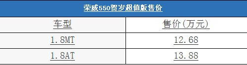 上汽榮威550推出賀歲限量版車型,共有2款車型,新車價(jià)格分別為榮威550賀歲版限量1.8MT車型12.68萬元、1.8AT車型13.88萬元。具體售價(jià)如下表: