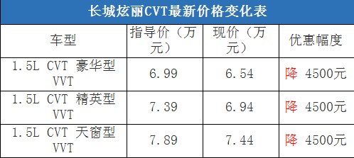 近日,編輯從北京地區(qū)綜合經(jīng)銷商處了解到,購(gòu)買長(zhǎng)城炫麗CVT車型有4500元的現(xiàn)金優(yōu)惠,店內(nèi)有黑色現(xiàn)車在售,部分車型預(yù)定等待10天左右就可以提車。據(jù)經(jīng)銷商透露,消費(fèi)者要想以這個(gè)價(jià)格提車,需要在店內(nèi)做購(gòu)車一條龍服務(wù),其中車輛四項(xiàng)基本保險(xiǎn)可以打8折(約合2800-2900元左右)。以下是長(zhǎng)城炫麗CVT最新價(jià)格變化表: