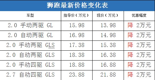 近日,編輯從北京地區(qū)綜合經(jīng)銷商處了解到,獅跑全系的現(xiàn)車充足,基本上可以滿足消費者在春節(jié)期間的需求;目前購車全系可以優(yōu)惠2萬元現(xiàn)金,性價比很不錯。據(jù)經(jīng)銷商透露,消費者要想以這個價格提車,需要在店內做購車一條龍服務,其中車輛四項基本保險可以打8.5折(約合4500-6300元左右)。以下是獅跑最新價格變化表: