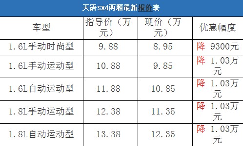 近日,編輯從北京地區(qū)長安鈴木4S經(jīng)銷商處了解到,天語SX4的1.6L排量車型現(xiàn)車充足,顏色也非常齊全,目前購車最高有1.03萬元的現(xiàn)金優(yōu)惠,性價比很不錯。以下是天語SX4最新價格變化表: